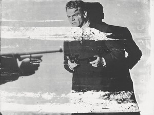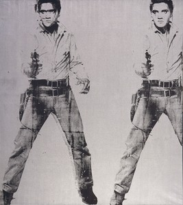 Warhol always aimed high and low, far and wide. Perhaps that nice raucous night extended to the similarly “terribly silkscreened” early Cagney. Perhaps, too, in the throes of his artistic jerk-off, he had in his mind the picture of a straight-backed Elvis, gun aimed in his line of sight, shaking and waiting for it to go off. The orgasm: the paintings’ reception, their purchases, their status as legend. A night to remember.