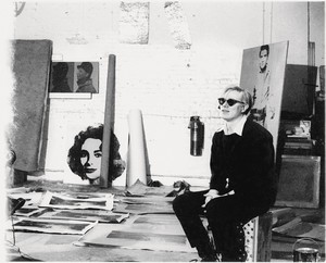 Andy Warhol with a Liz and an Elvis painting at the Factory, 231 East 47th Street, New York, c. 1965. Photo: Billy Name